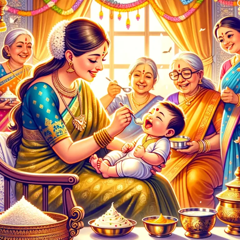 Annaprasana marks an important milestone in a Hindu child’s life, where the child is fed solid food, typically rice, for the first time. This ritual symbolizes the transition from a liquid to a solid diet, emphasizing the importance of nutrition in a child’s growth and development